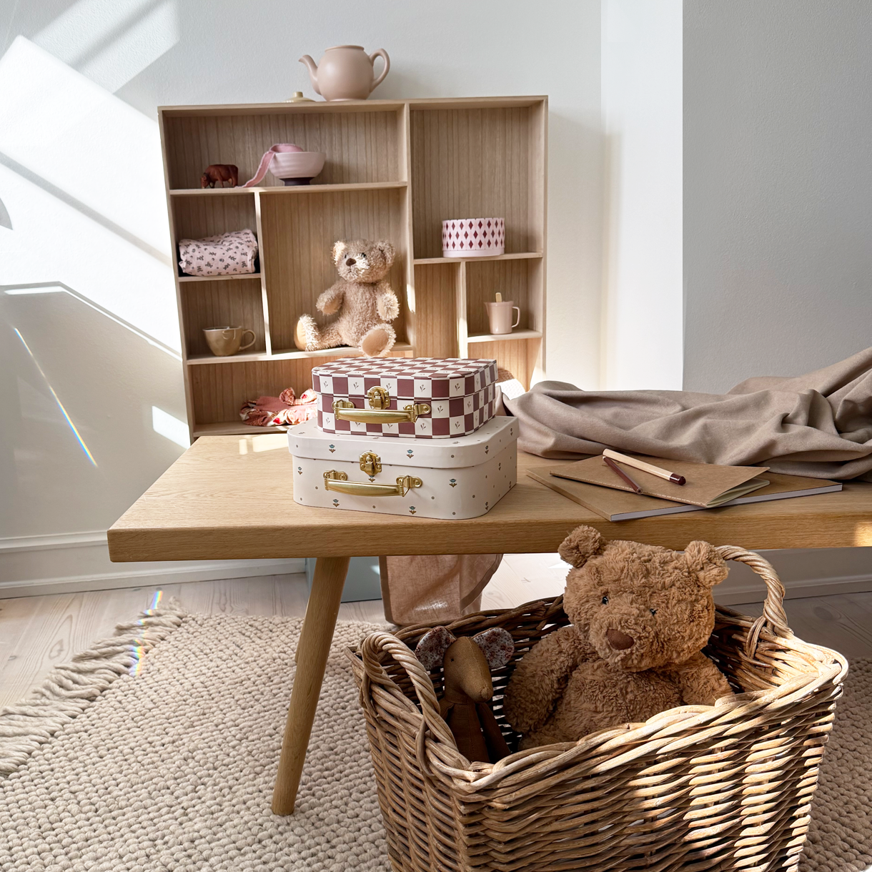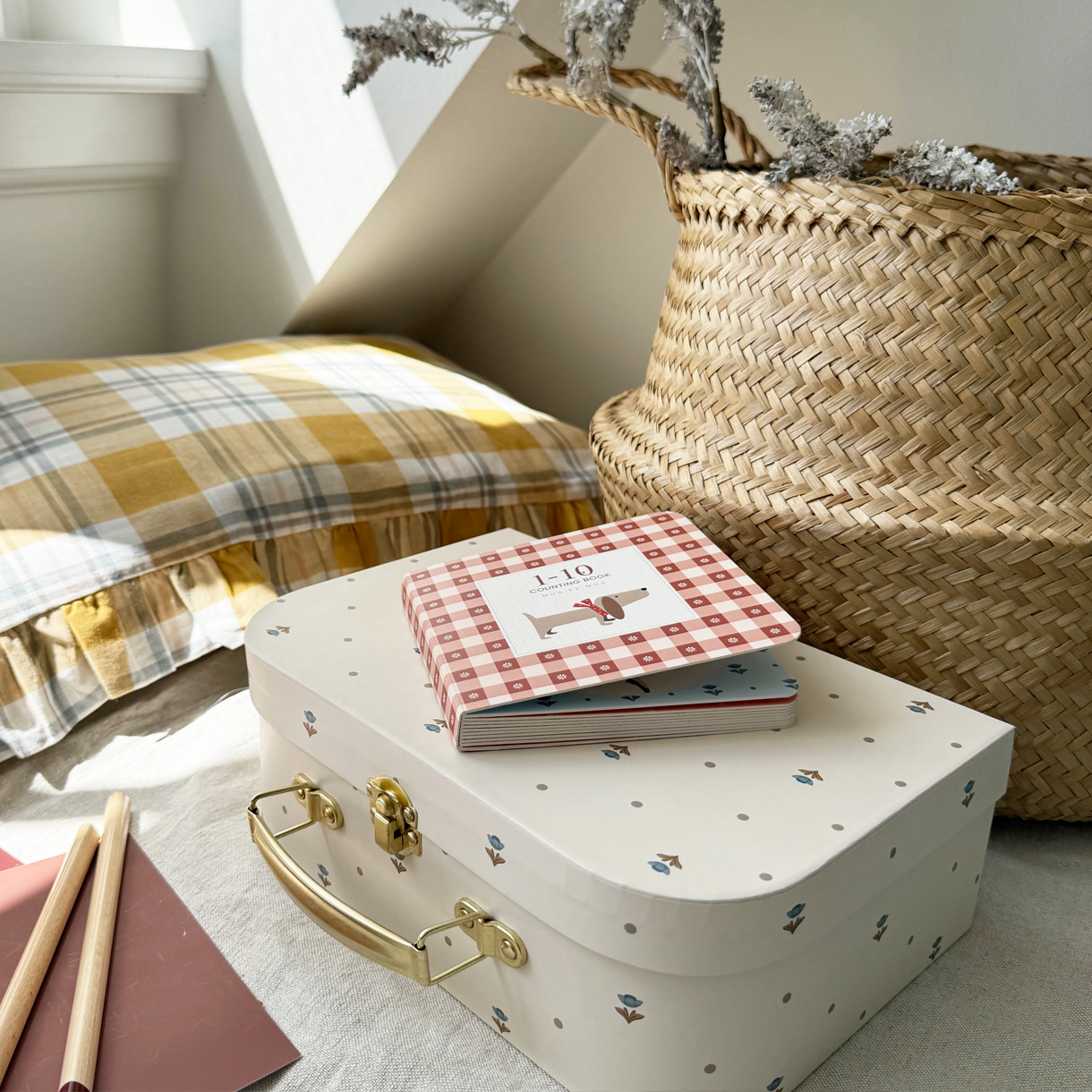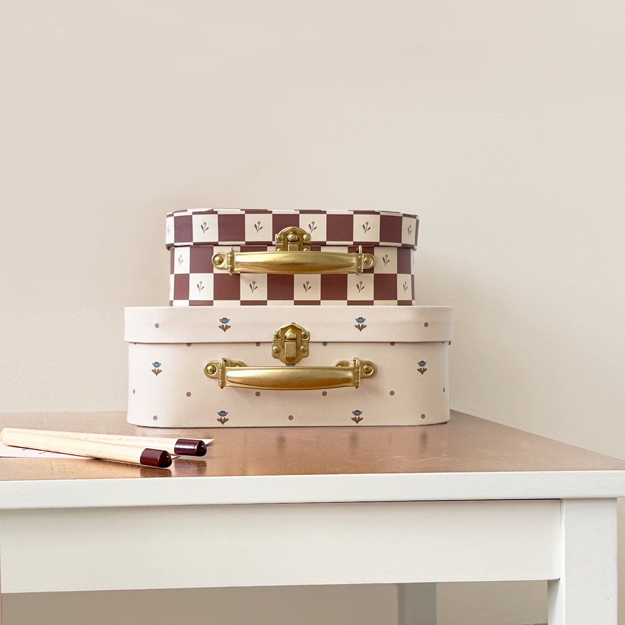 Kuffertsæt bestående af 2 stk. Perfekt til opbevaring og dekoration på barnets værelse. Fremstillet af robust pap med metalhåndtag. Charmerende og trendy design.