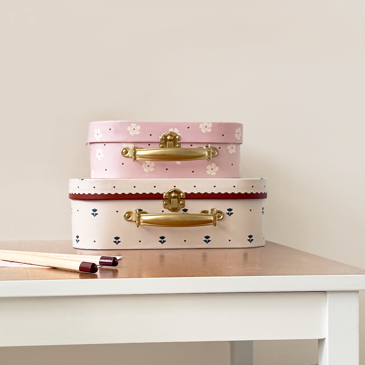 Kuffert sæt perfekt til opbevaring, de giver ikke blot en unik indretningsmulighed, men hjælper også med at organisere legetøj og andre småting. Skab orden og stil på én gang ved at gemme ting i de charmerende kufferter, som børnene vil elske.