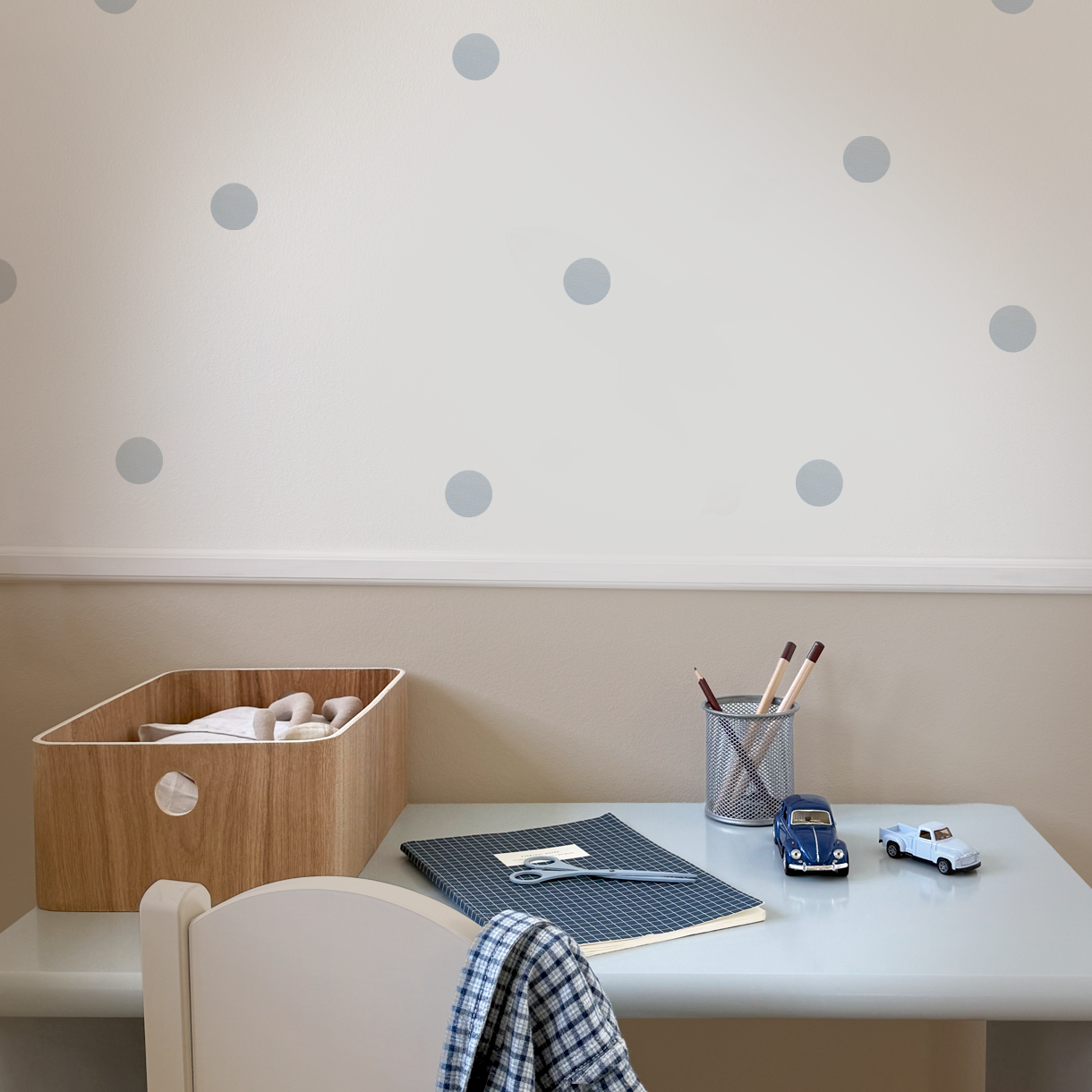 Forvandel dit rum med wallsticker 4,5 cm prikker, der danner et elegant tapetmønster, som nemt kan opsættes på få minutter. Det skaber en hyggelig atmosfære i indretningen. Kan bruges på glatte vægge, skabe og interiør med glat overflade. Dansk design i høj kvalitet produceret i Danmark.